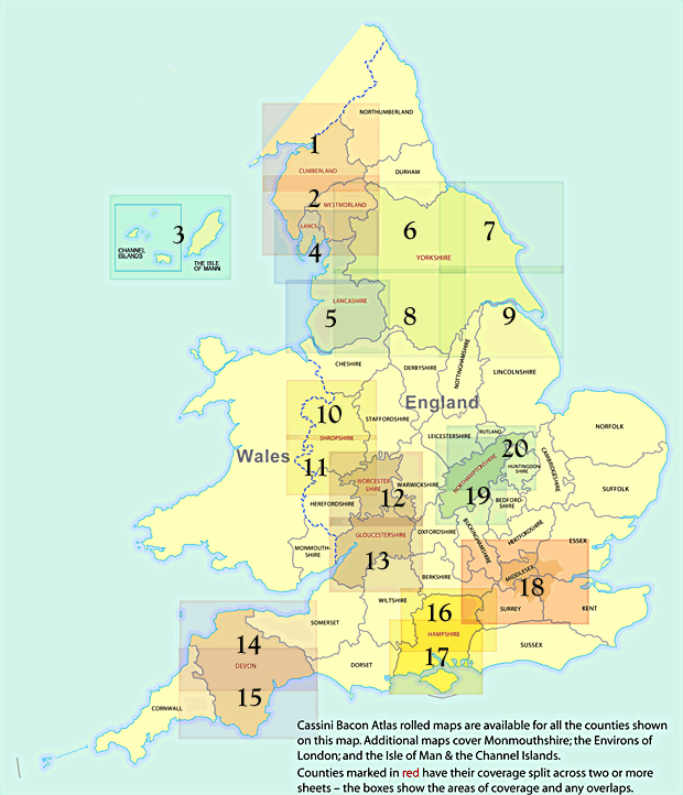 Cassini Bacon Atlas rolled maps are available for all counties shown below. Additional maps cover Monmouthshire, The Environs of London and the Isle of Man & the Channel Islands. Counties marked in red, on the map below, have their coverage split across two or more sheets - the boxes show the areas of coverage and any overlaps.
